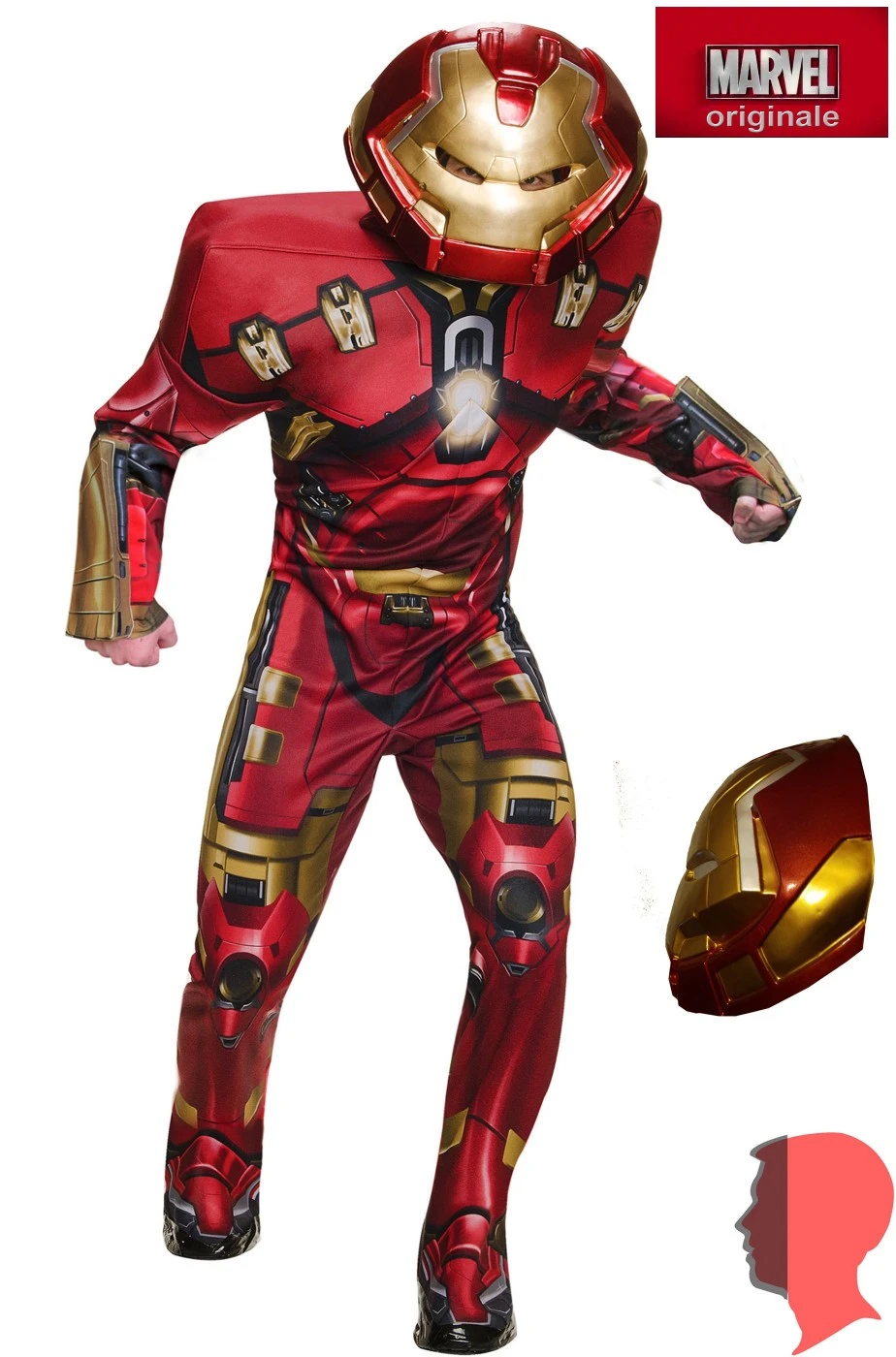 Originale versione di Ironman, l’uomo d’acciaio di Tony Stark, nella versione potenziata Hulkbuster indossata per arginare la strapotenza di The Hulk. Il costume include la tuta con la parte coprispalle squadrata grazie ad una sottile imbottitura a potenziamento dell’armatura. Belllissima stampa serigrafica ad effetto 3D. Maschera allargata in plastica SOLO FRONTALE.