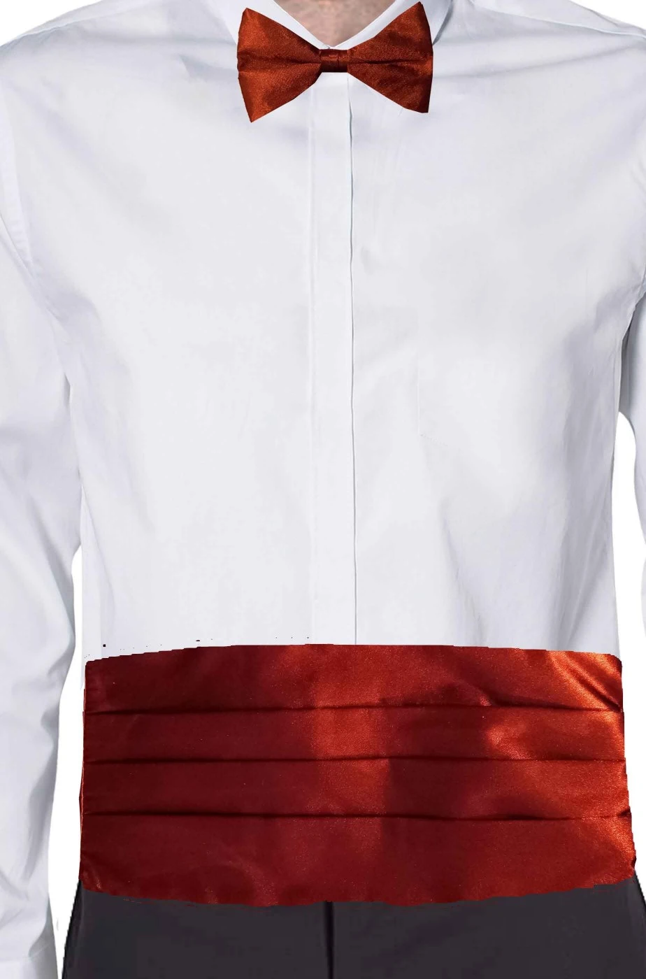 Da indossare sullo smoking per la serata di gala con un tocco di colore ti proponiamo questa parure composta dalla fascia da vita a tre pieghe rossa bordeaux da smoking e dal cravattino rosso bordeaux in nuance gia’ annodato a farfallino o papillon.