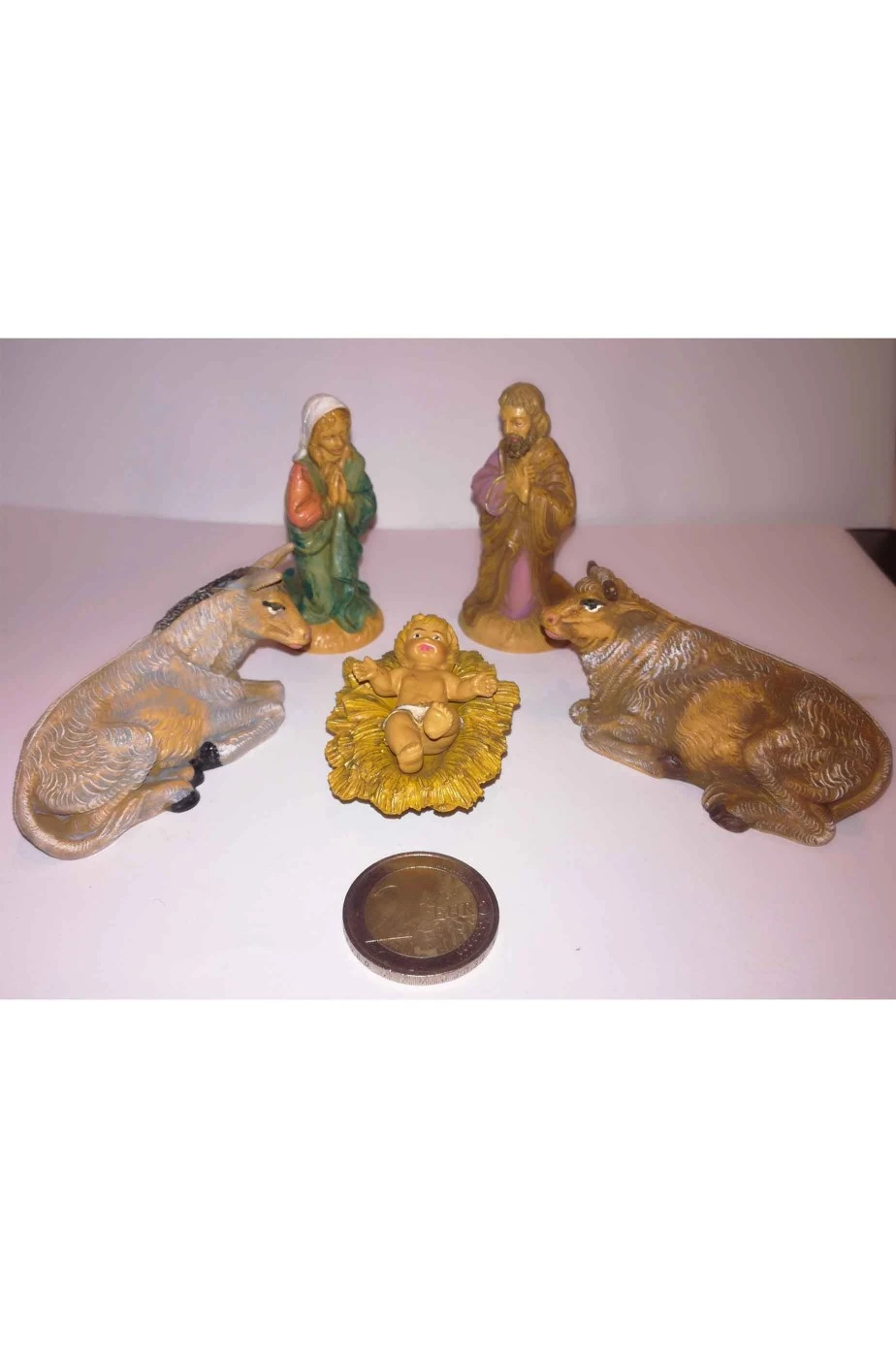 set di cinque statuine del presepe nativita’ completa Gesu’ bambino nella mangiatoia (in due parti divisibili), San Giuseppe, Maria, Bue ed Asinello. Il Bambinello e’ separato dalla mangiatoia per poterlo mettere solo la notte del 24 dicembre per Natale. Molto ben rifinite per il tuo presepio. Altezza di Giuseppe circa 6cm.