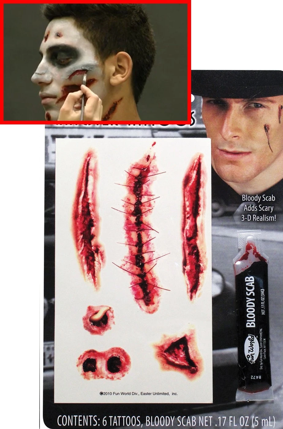 Per il trucco Halloween fai da te, un facile set di cicatrici, ferite e fori di proiettile a tatuaggio