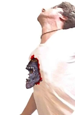 Va ritagliata a misura, incollata con lattice liquido e poi truccata e completata. E se te la senti di osare, puoi provare a realizzare la testa di alien che esce dalla tua T-Shirt come mostrato nella fotografia secondaria ma ricordati che devi creare una base su cui incollare la bocca di alien (magari da indossare con un girocollo o un paio di bretelline di nastro) perche’ il tessuto della TShirt non reggerebbe il peso della bocca.