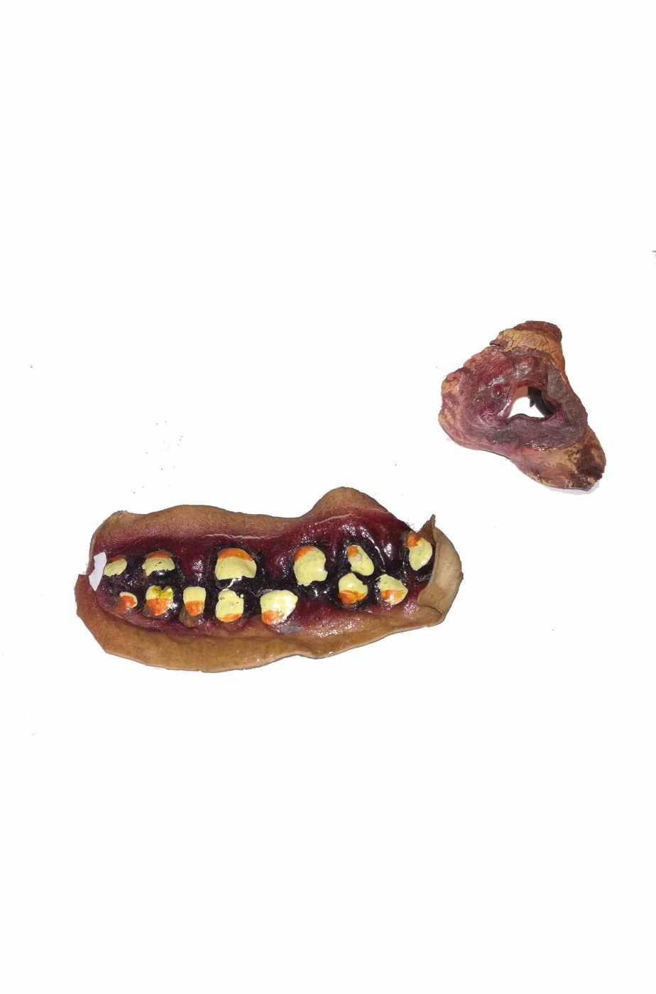 Il trucco horror si basa sulla creazione di protesi che modificano il corpo in maniera totalmente innaturale. Piu’ l’immagine e’ innaturale, rispetto alle abitudini, e piu’ scatena inconscia repulsione. Per questo una bocca di un mostro posta sul corpo in una posizione strana, per esempio su una guancia o sul collo, fa orrore. Questa e’ una bocca di mostro realizzata in lattice e pretruccata che potete incollare dove preferite. Inclusa nel pacchetto anche una ferita circolare in lattice a forma di foro di proiettile.