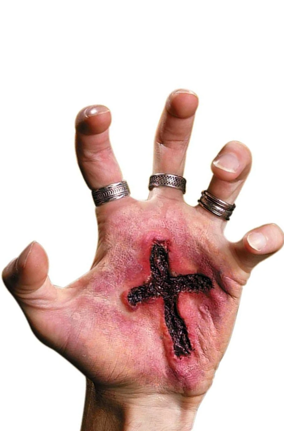 Trucco in lattice croce insanguinata Contiene mascherina in lattice con croce pre pitturata colla per applicare al corpo 3,5 ml e liquido per rimuoverla 3,5 ml