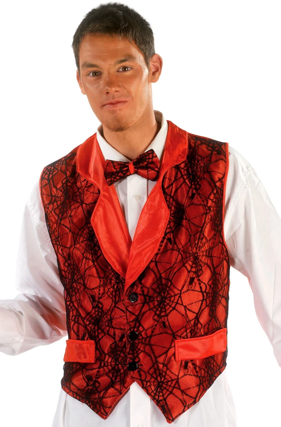 Gilet rosso con ragnatela applicata sopra in trasparenza e cravattino papillon per barman, operatori di locali, discoteche, bar, maitre, per la serata di Halloween dietro al banco ma con classe ed eleganza. Grande risvolto lanciato. Taglia 56 per operatori un po’ robusti, quindi. Può essere un diavolo, un demone, uno stregone ma in realtà sarai molto elegante dietro al banco anche per hotel di lusso e qualità.