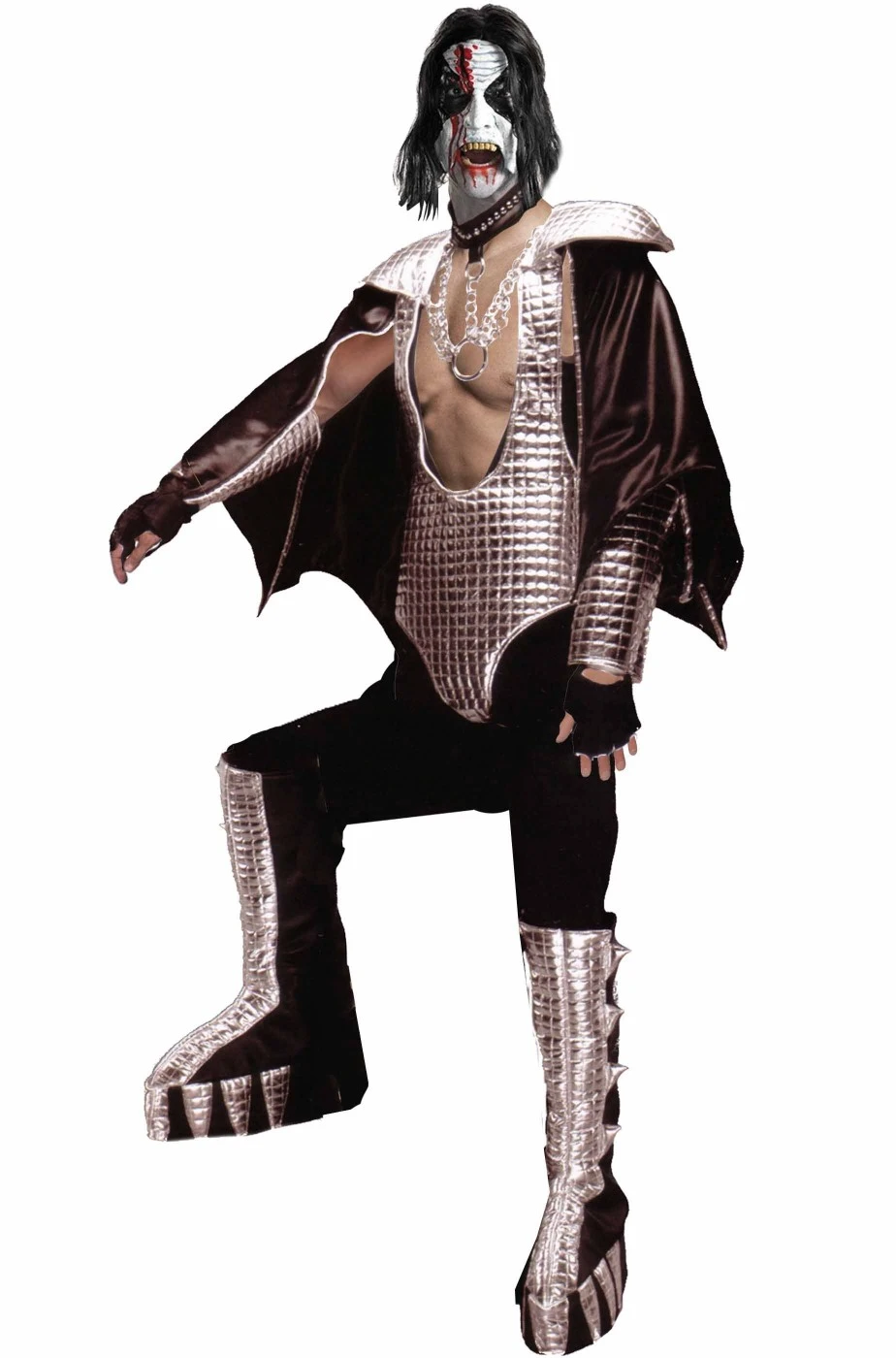 Incredibile gruppo di vestiti di scena adulto per carnevale ma, soprattutto, per una cover band del gruppo che ha segnato un’epoca, i Kiss. Questi sono quattro costumi realizzati con grande cura con materiali durevoli e di qualita’, catene in metallo e borchie. Cat Man, Starchild, The Demon e Starchild potrete essere voi con questi abiti che farebbero quasi invidia a Gene Simmons, Paul Stanley, Ace Frehley e Peter Criss. Tutti in taglia M sono composti dalle parti che vedete in fotografia (parrucche non incluse) con i copristivale (NON SONO STIVALI INTERI: SONO COPRISTIVALE). Demon e Spaceman hanno le armature realizzate in gommapiuma foderata, Demon ha il mantello a pipistrello e le catene in metallo. Catman ha le borchie in metallo e parti in plastica simile alla pelle. Le tute sono abbastanza elasticizzate. I costumi sono tutti in taglia M