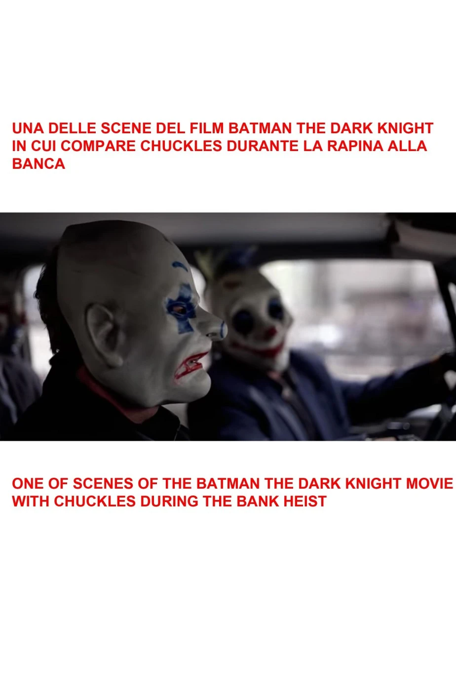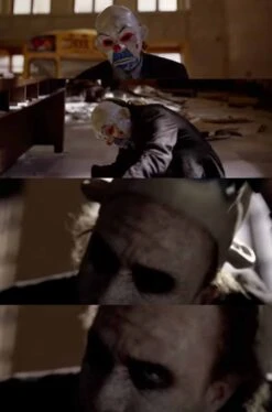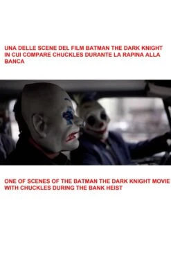 Gruppo di quattro maschere in gomma, dipinte a mano, i sette nani rapinatori criminali del Joker interpretato da Heath Ledger in Batman The Dark Knight.