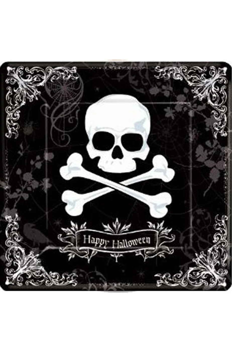 Piatto di plastica di portata nero con teschio a tema Halloween 30cm di lato. Ossa incrociate come il Jolly Roger, la bandiera dei pirati.