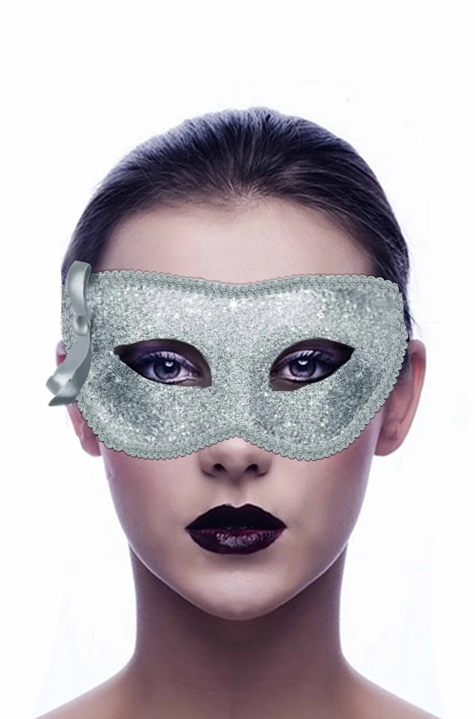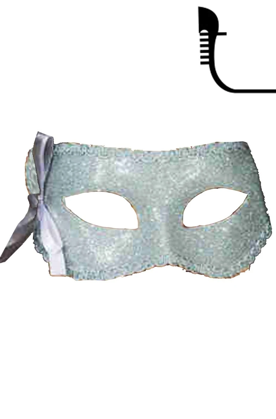 Elegante ed economica maschera di carnevale in stile veneziano solo sguardo contorno occhi di colore argento con bordature in passamaneria e fiocco laterale.