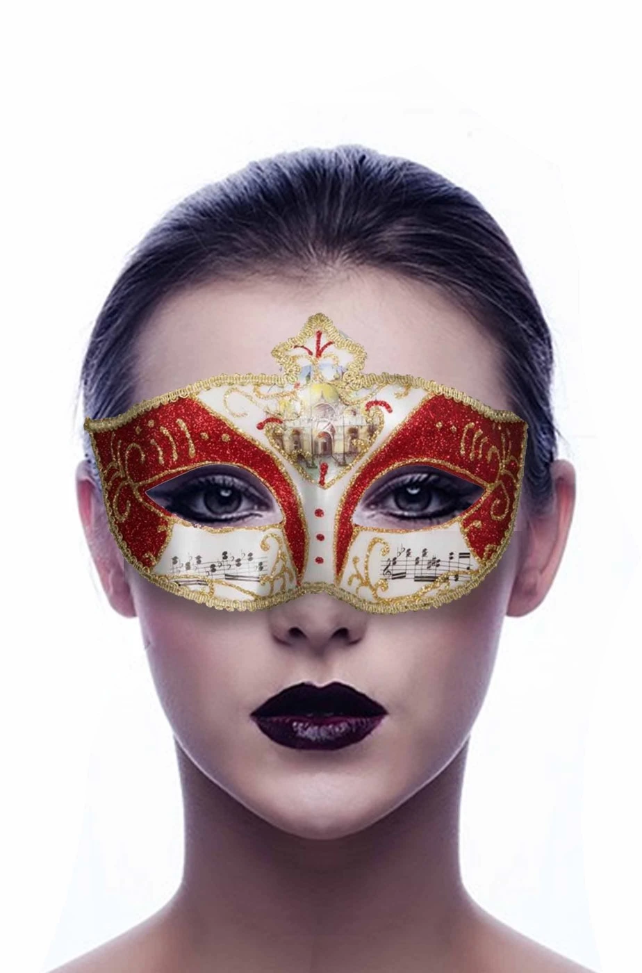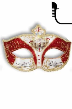 Se ti piace il carnevale e sei un fan del primo artista pop della storia della musica, Wolfgang Amadeus Mozart, ti proponiamo questa elegantissima maschera di carnevale in stile veneziano barocco rococo’ bianca, rossa ed oro con stampa di motivi musicali