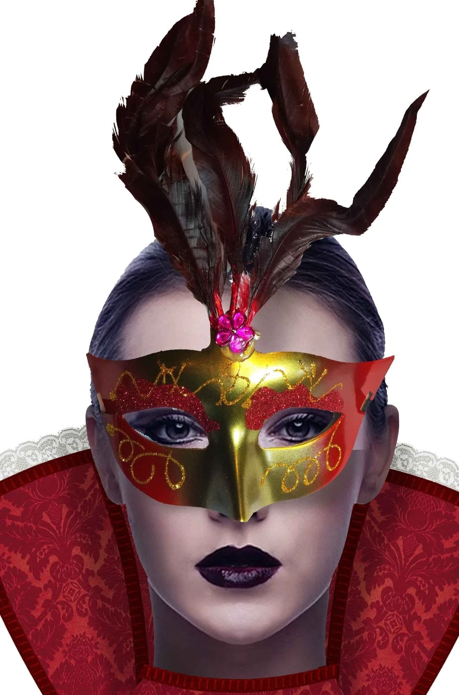 Maschera di carnevale economica di plastica in stile veneziano con base color oro con sfumature rosse e piume sulla fronte. Decorata con fili dorati glitter brillantini
