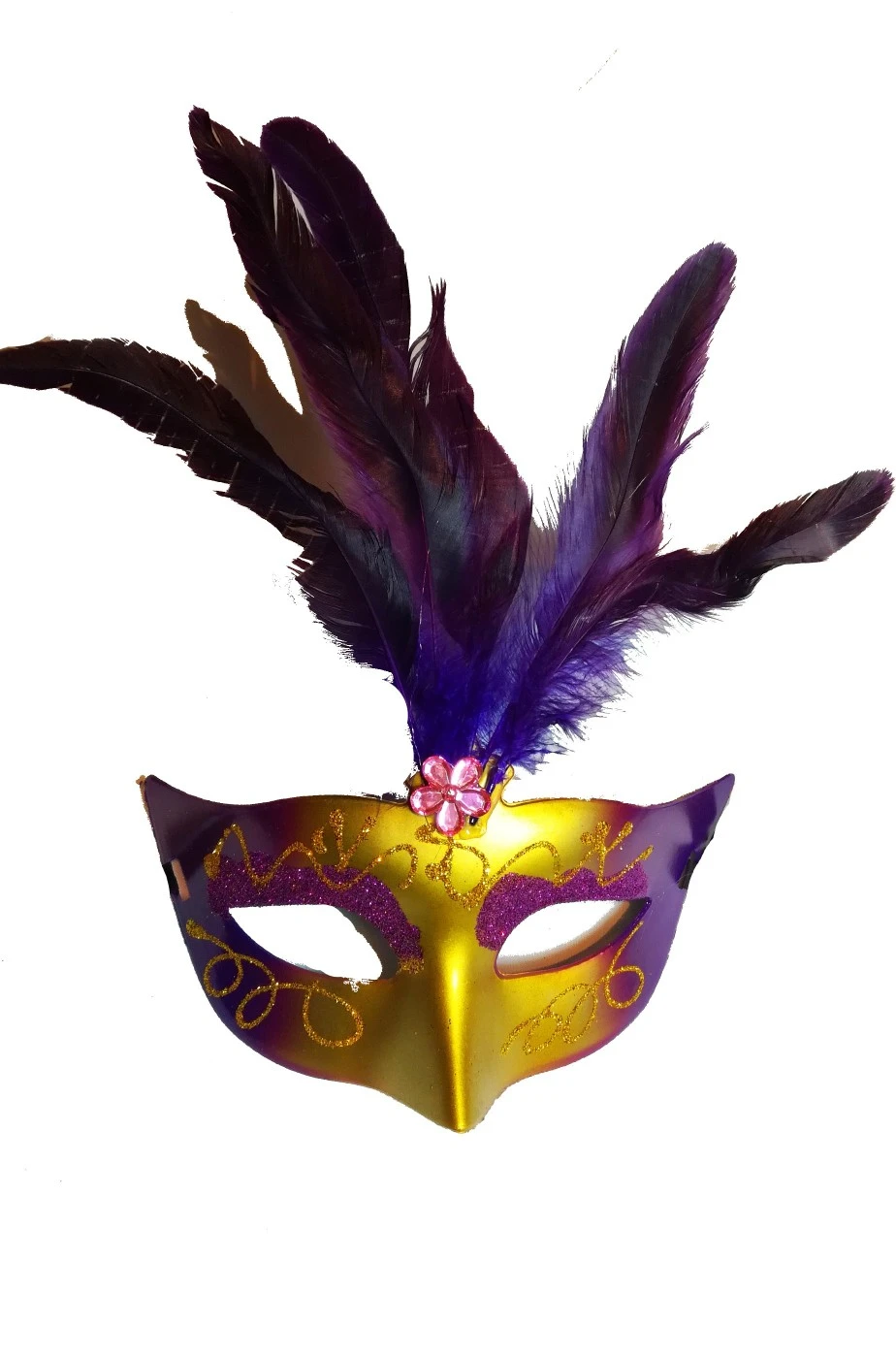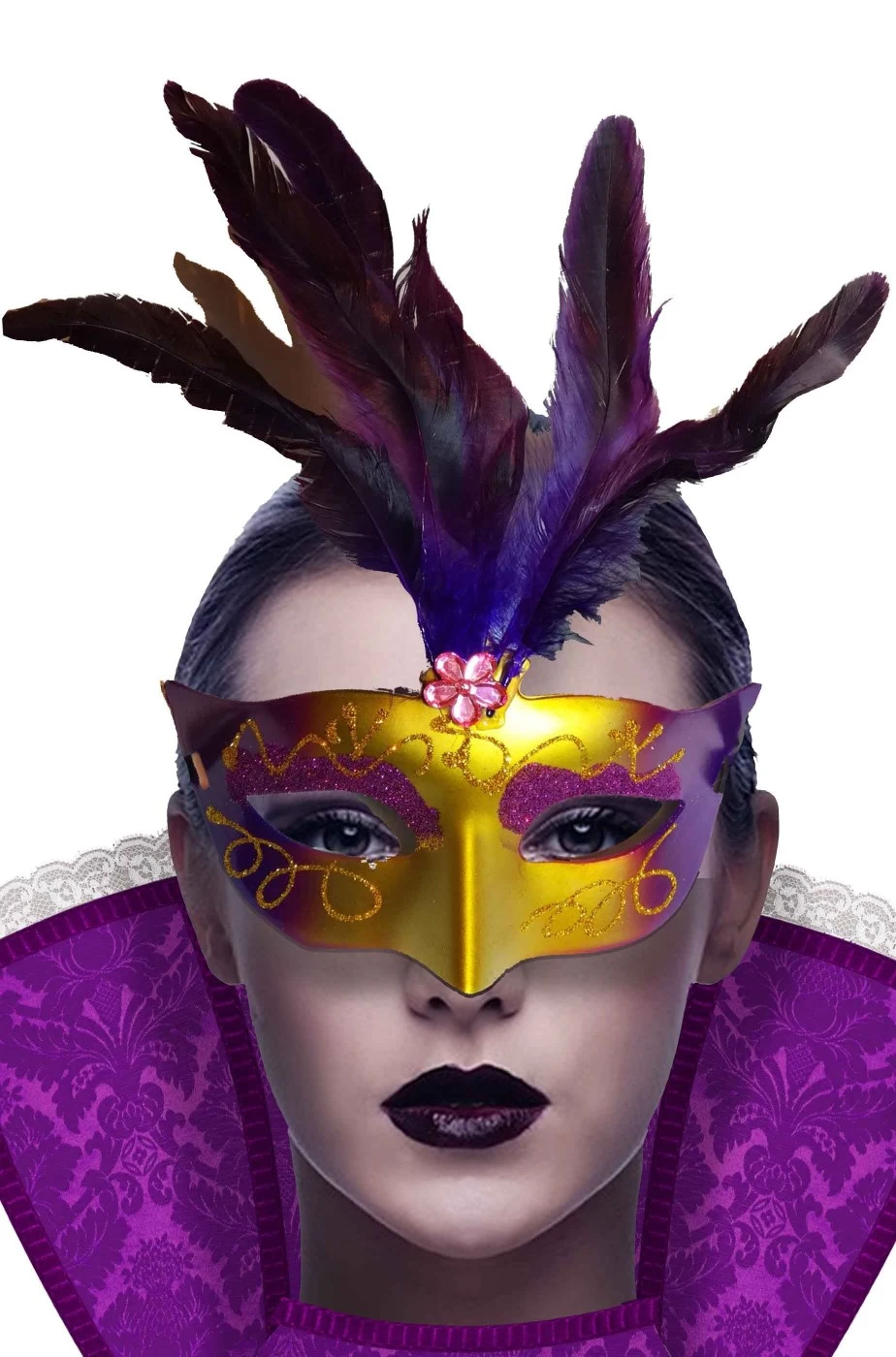 Maschera di carnevale economica di plastica in stile 700 con piume con base color oro e finiture viola con decorazioni dorate glitter. Una maschera in stile barocco rococò dai colori molto forti e vivaci. A basso costo, veloce da indossare, si sistema legandola con i laccetti dietro alla testa.