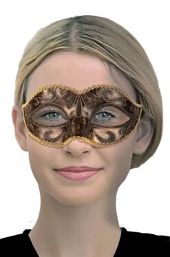 Oscura come il tuo spirito, affascinante come il tuo sguardo, questa maschera di carnevale e’ di un signorile color bronzo che la rende perfetta per mille costumi di carnevale, da un costume in stile veneziano classico barocco rococo’ per un casanova molto elegante ad un vestito a tema antico romano o greco per cui vuoi nascondere il viso.