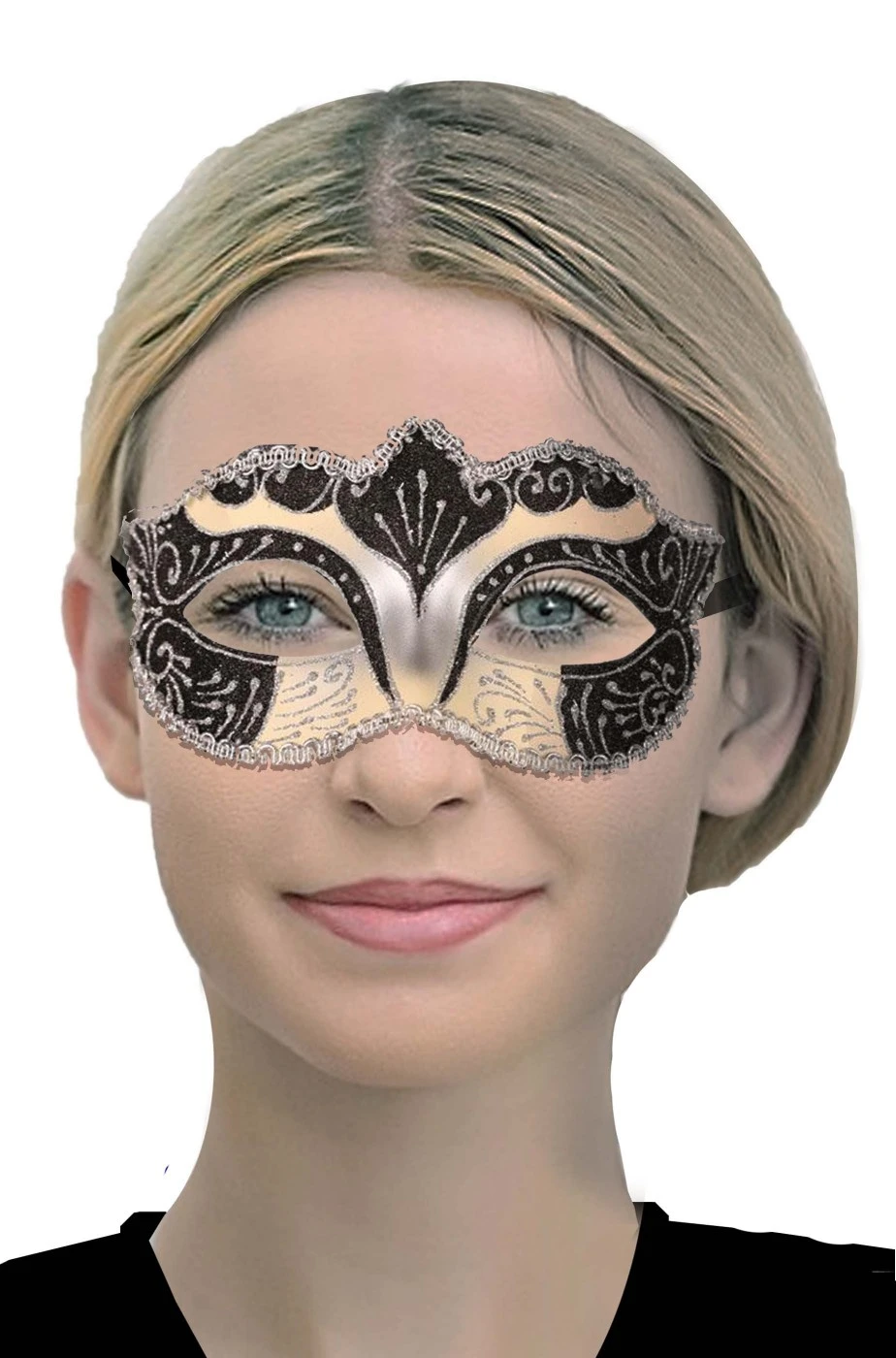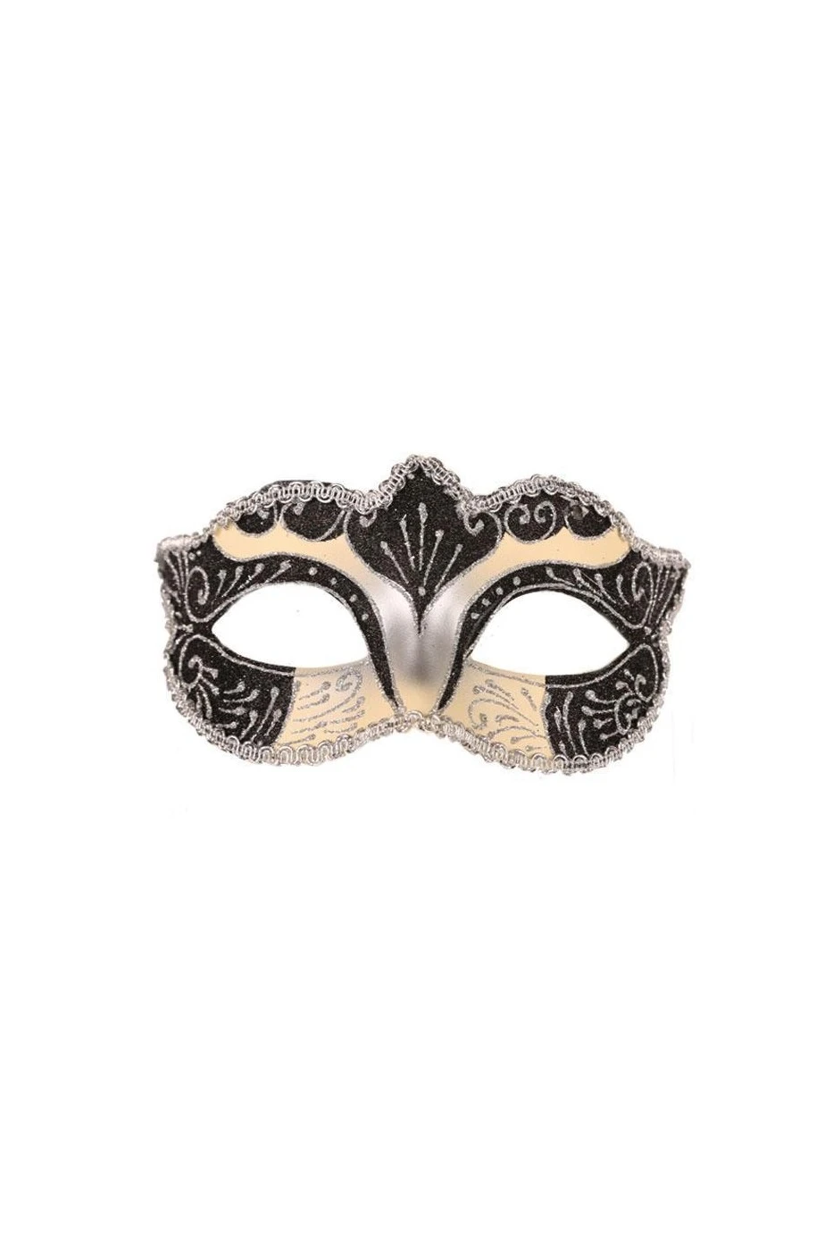 Per completare un costume da Casanova, da indossare in un bal masque’, per completare un signorile costume di carnevale di classe, questa maschera di carnevale in stile veneziano e’ di un elegante color panna e nero con finiture in passamaneria e damaschi dipinti glitter argento che la rendono bellissima sia per il carnvale di sera che per il giorno.
