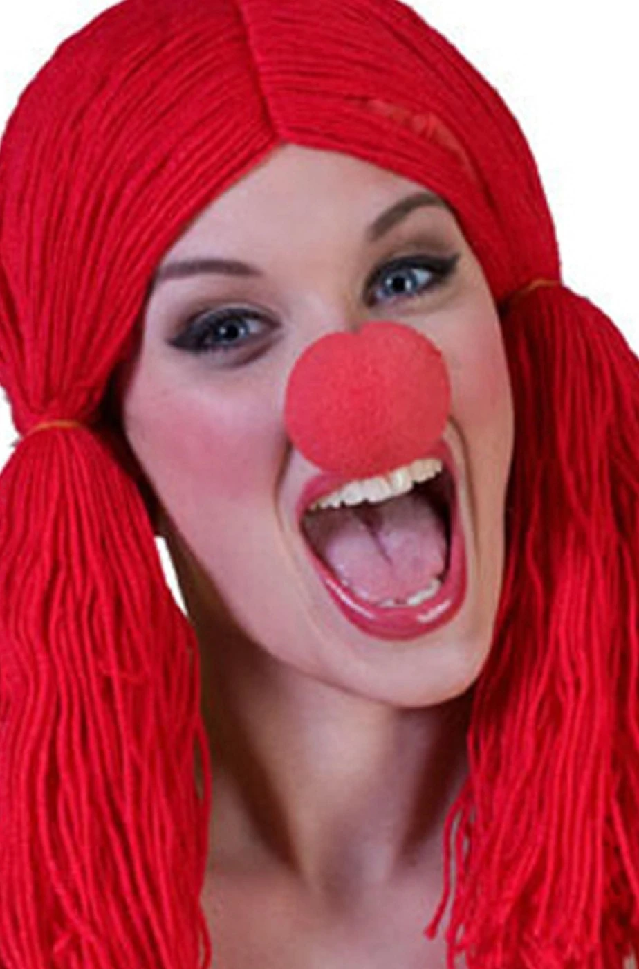 Naso da pagliaccio in spugna. Si indossa calzandolo sulla punta del naso quindi la sua tenuta dipende dalla forma del vostro naso. Sebbene calzi normalmente nella maggioranza di nasi, potrebbe essere necessario bloccarlo con colla da baffi oppure con lattice.