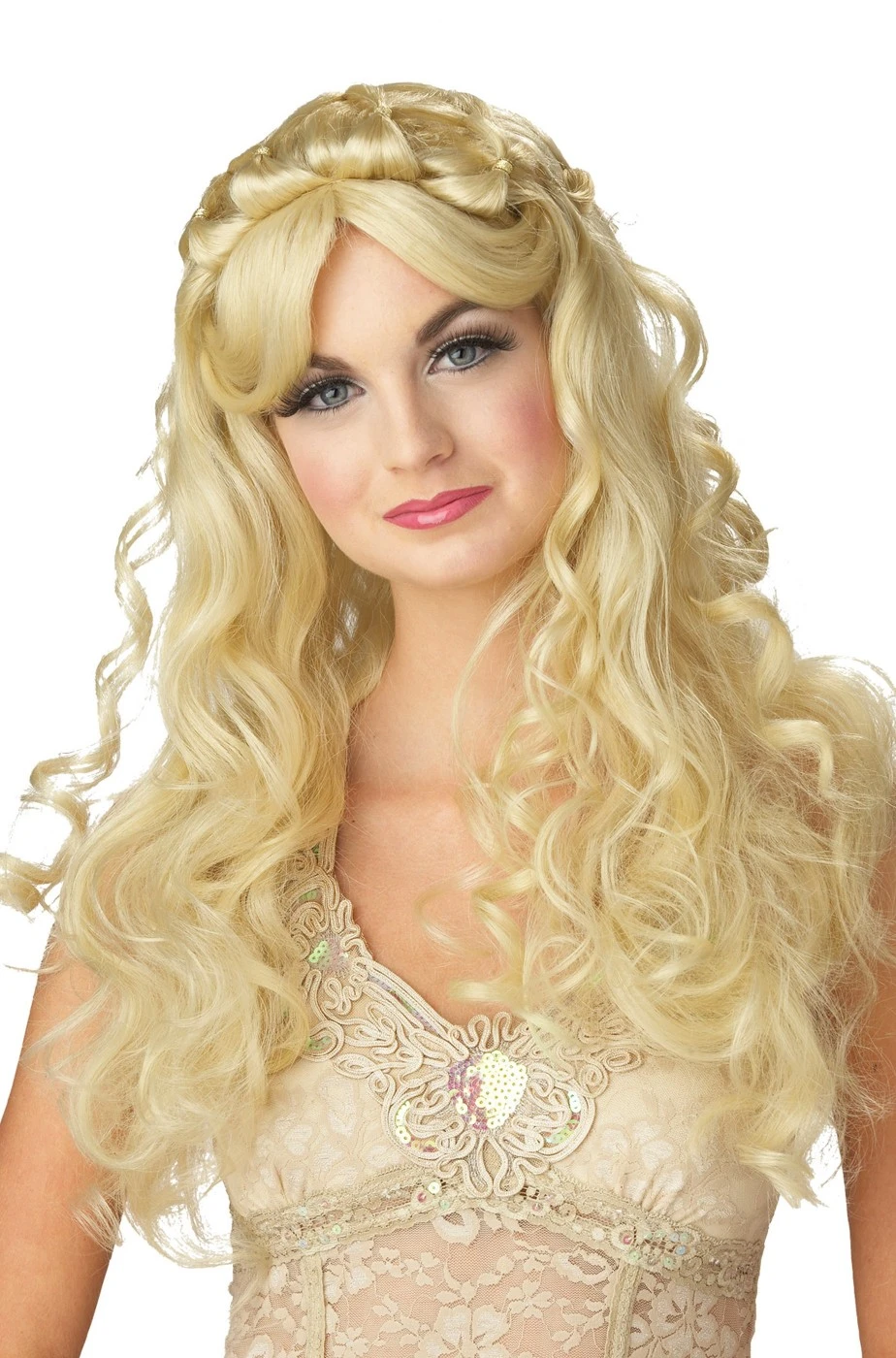 Una bellissima e lunga parrucca bionda senza frangia da elfa, medievale, rinascimentale o anche per un angelo o una dea greca con capelli leggermente mossi ed acconciati.