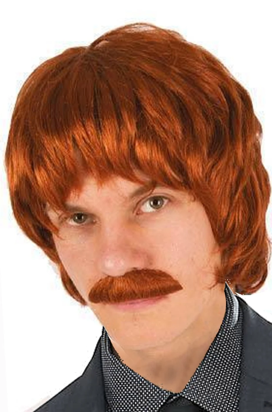 Parrucca finta di colore rosso ruggine pel di carota con baffi dello stesso colore.