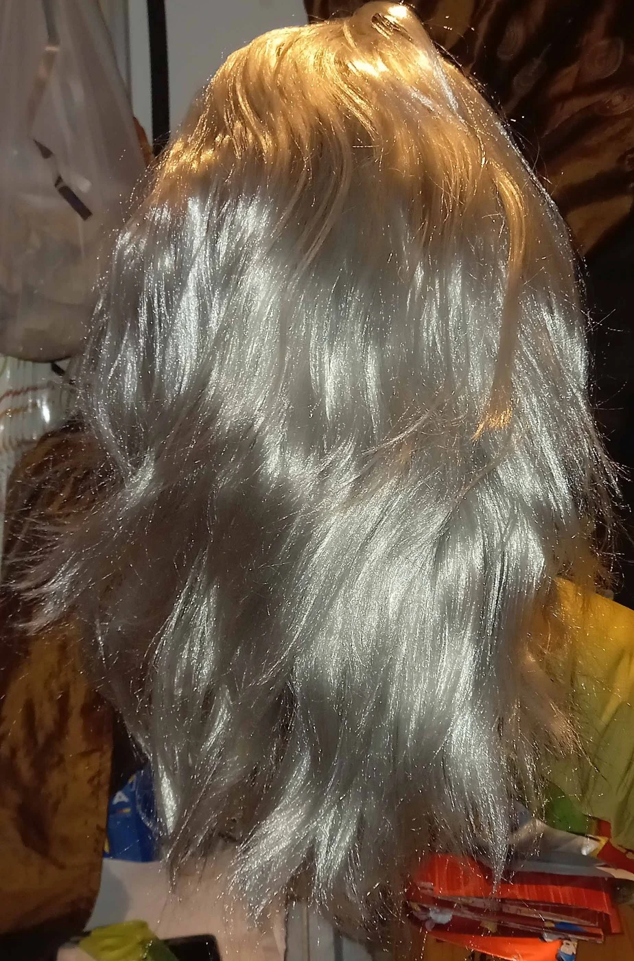 Sebbene sia di poliestere, questa parrucca grigia e’ davvero di ottima qualita’ ed e’ foltissima.