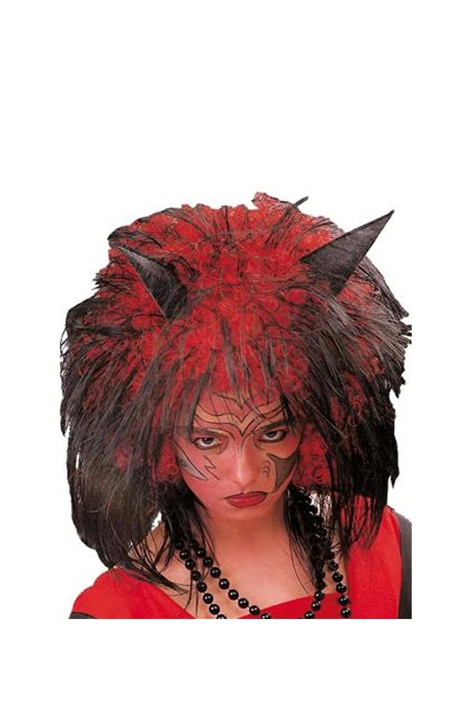 Parrucca per costumi di halloween da diavolo diavolessa o diavoletta rossa con meches nere e corna.