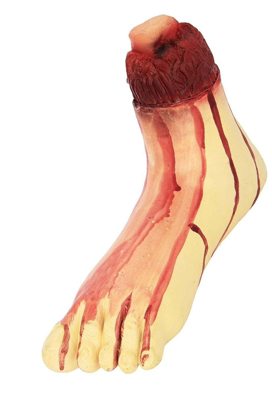 Piede finto insanguinato strappato con ossa spezzate dimensione naturale in gomma imbottita.
