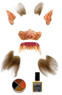 Completissimo set per realizzare un impressionante trucco da lupo mannaro o licantropo grazie alla mascherina in lattice con il naso da bestia o da uomo lupo da incollare al viso con la colla da prostetica inclusa, le orecchie finte a punta da applicare sulle proprie con lo stesso mastice, le zanne, una completa palette di trucco teatrale a 4 colori a base paraffina per il makeup ed i ciuffi di pelo da incollare al viso (parrucca non inclusa).