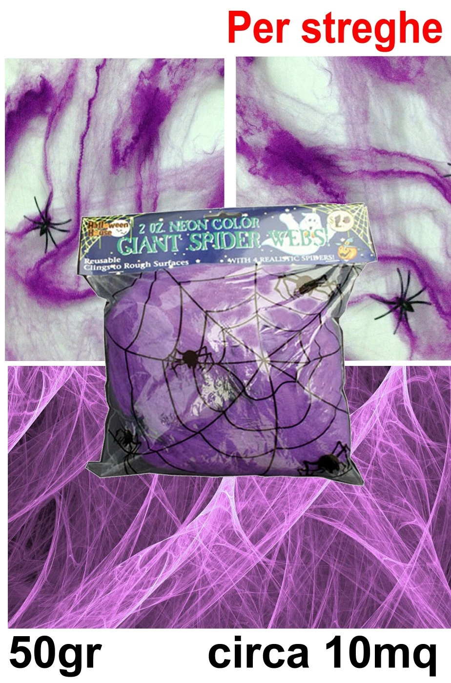 Per allestire e decorare la tua sala, il tuo bar, il tuo locale, la discoteca per la serata di Halloween a tema streghe, la ragnatela finta viola è l’ideale, soprattutto se hai pareti o arredi chiari. La ragnatela crea ambientazioni efficaci rapidamente, si attacca ovunque senza fatica, si tira e si estende con semplicità realizzando aree misteriose e spaventose. Se la tiri molto diventa sempre più realistica.