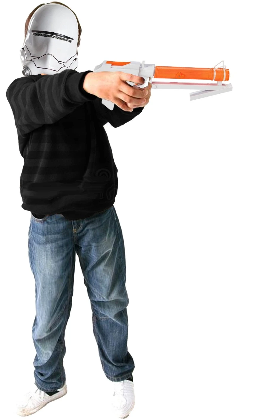 Questo pacchetto giocattolo da bambino di Star Wars e’ composto dalla maschera da guardia imperiale Flametrooper (solo maschera frontale, NON E’ IL CASCO INTEGRALE per motivi di sicurezza) e dall’introvabile pistola blaster bianca (con parti arancioni per legislazione sulla sicurezza delle armi finte, di plastica senza luci ne’ suoni, solo statica) come quella delle guardie imperiali o del Primo Ordine di Star Wars.