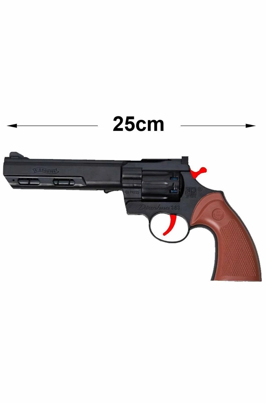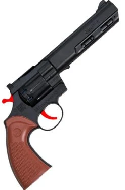 Il set include il cappello in floccato (finto feltro) e la pistola revolver giocattolo in plastica lunga 25cm.