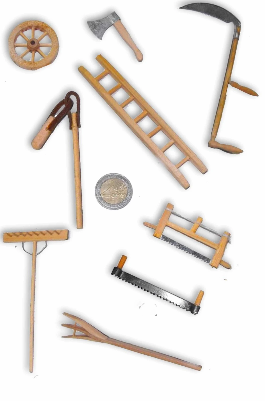Il pacchetto comprende ben nove attrezzi per i personaggi del presepe popolare, pastori, contadini o taglialegna tutti molto belli e realistici. C’è una ruota da carro in legno con i raggi, un’ascia con la lama in metallo ed il corpo in legno, una scala di legno, una bellissima falce lunga a due mani per tagliare il fieno, due seghe in legno e metallo per il taglialegna, un battigrano in legno e cuoio, un rastrello di legno ed un forcone a tridente per il fieno.