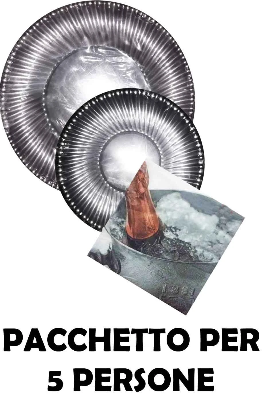 Confezione risparmio pacchetto per 5 persone per apparecchiare tavola color argento composto da 10 piatti di carta piani color argento da primo e secondo, 10 piatti di carta piani color argento da aperitivo e dessert e 20 tovaglioli di carta color argento.