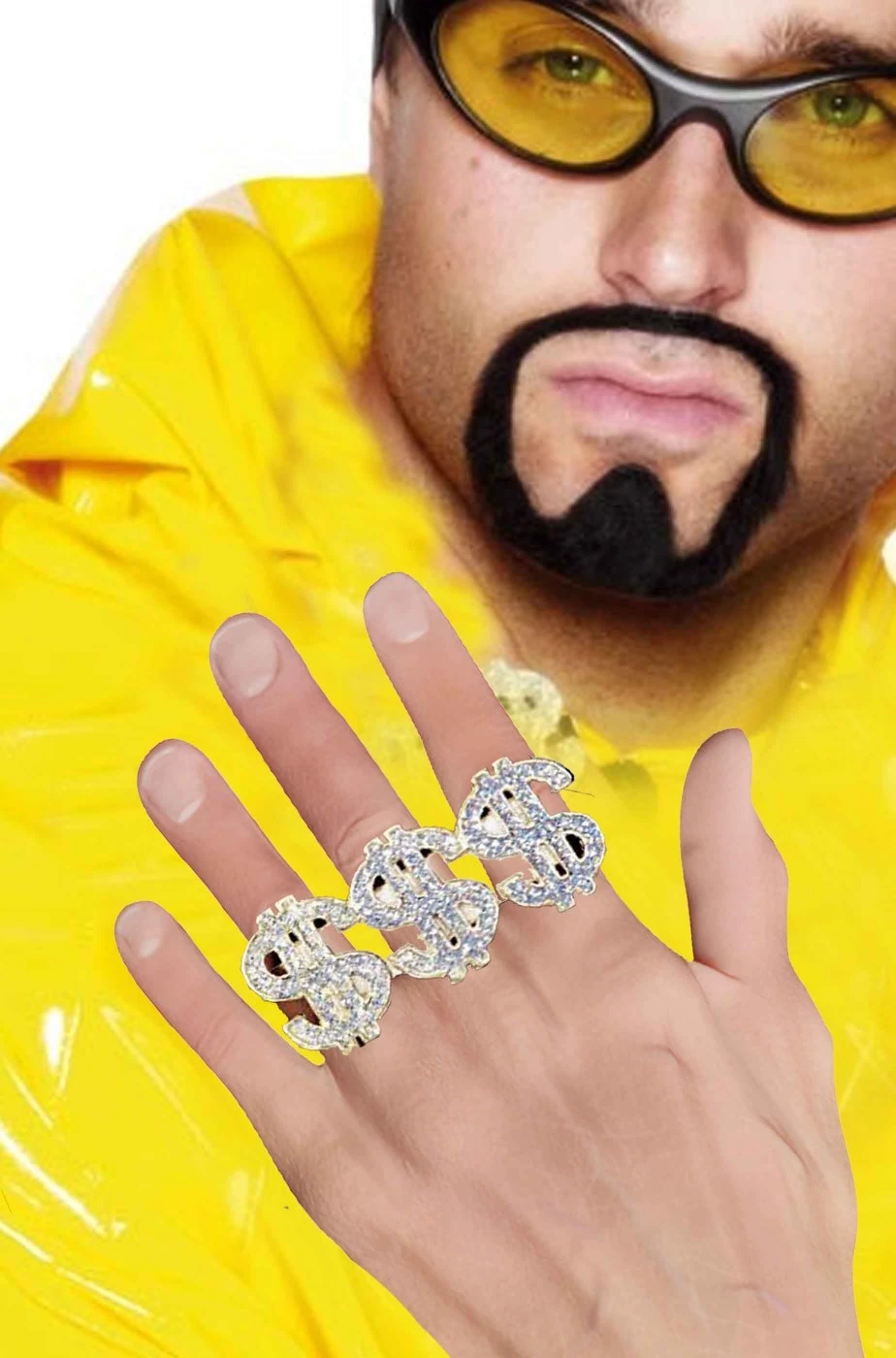 Adornato di ben tre simboli del dollaro USA $ colorati con brillantini questo anello dollaro da rapper adulto in plastica sara’ il perfetto complemento del tuo costume di carnevale da pappone o da duro rapper o perfino trapper degli slums.