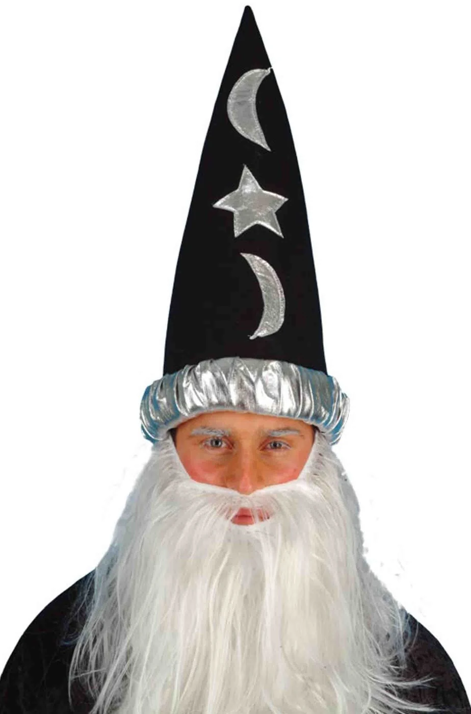 Nero ed adornato di stella e falci di luna, questo cappello e’ l’ideale per iniziare il tuo costume da negromante fai da te