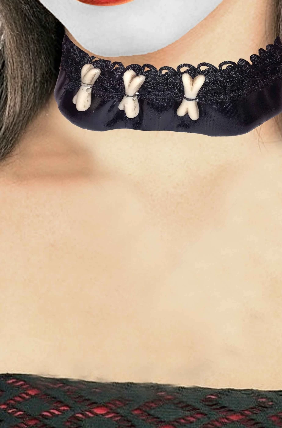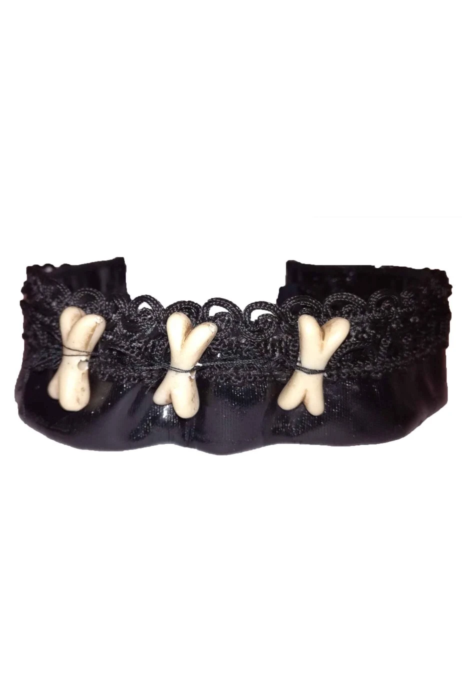 Collarino girocollo in vinile e passamaneria con ossa finte incrociate per costumi dark, gotici, dia de los muertos o day of the dead, l’Halloween sudamericano. Perfetta collana da indossare sotto ad un trucco da teschio di zucchero sugar skull