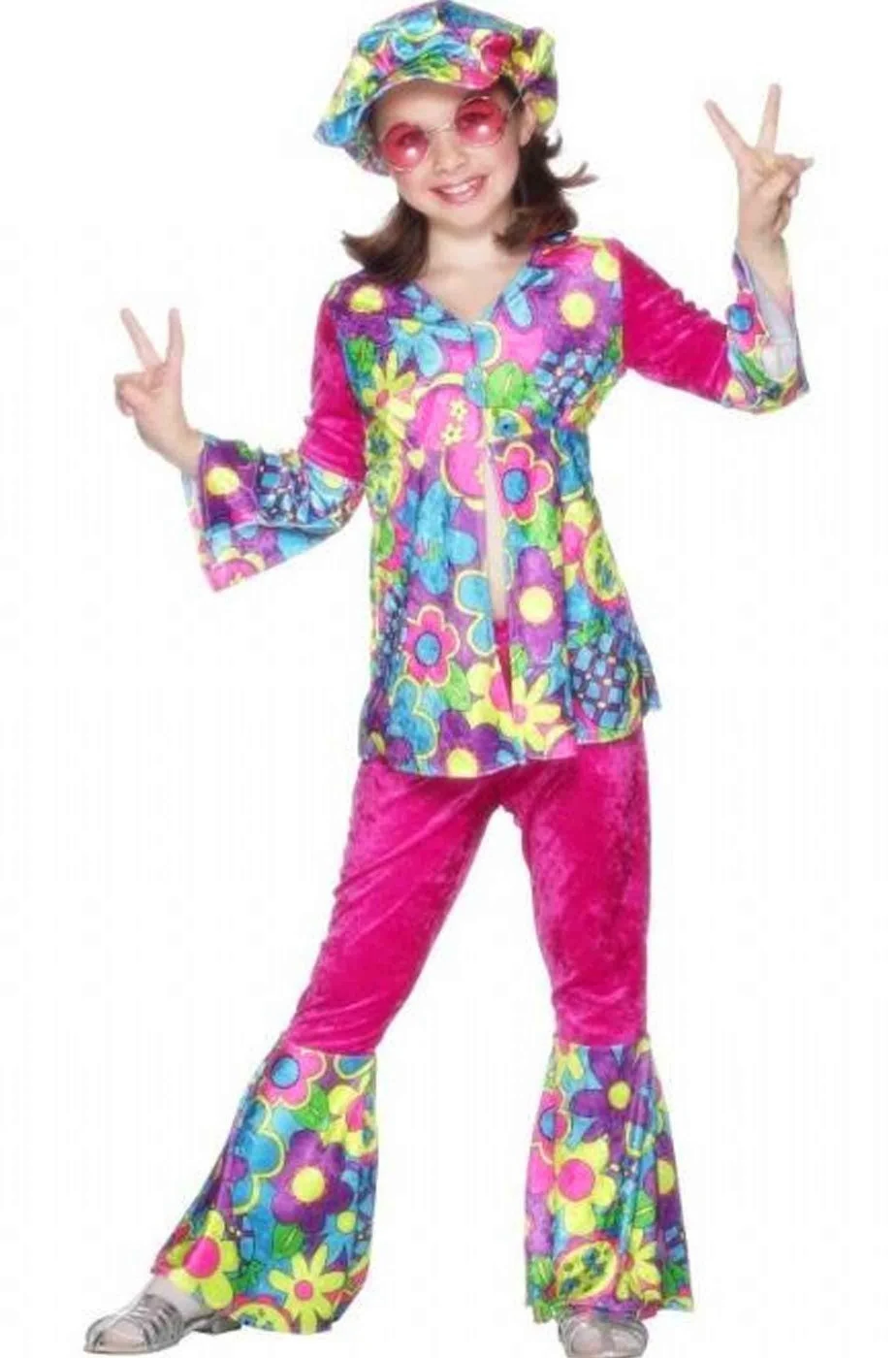 Questo abito di carnevale include il pantalone, la camicia e perfino il simpatico cappello floscio questo costume di carnevale Anni 70 bambina da Figli dei Fiori Flower Power. Un costume dai mille colori per una festa anni 70 hippie style da far indossare alla tua bimba e farle vivere con te gli anni della grande rivoluzione di liberta’ e sogni.