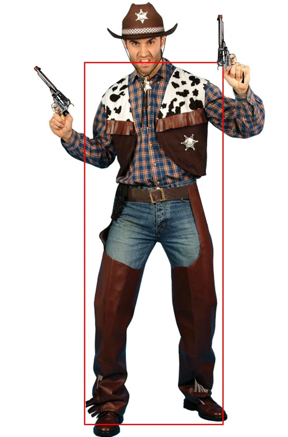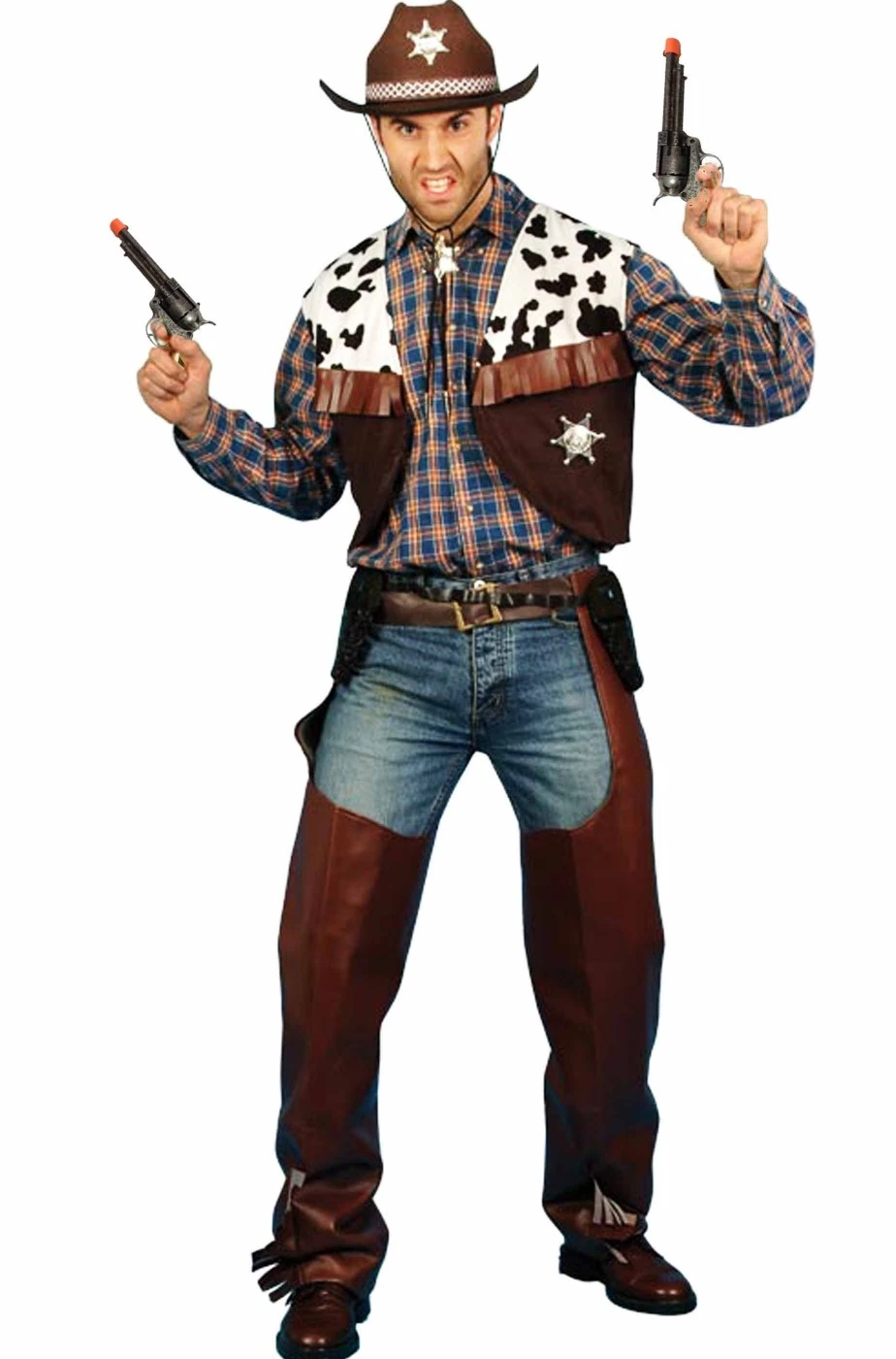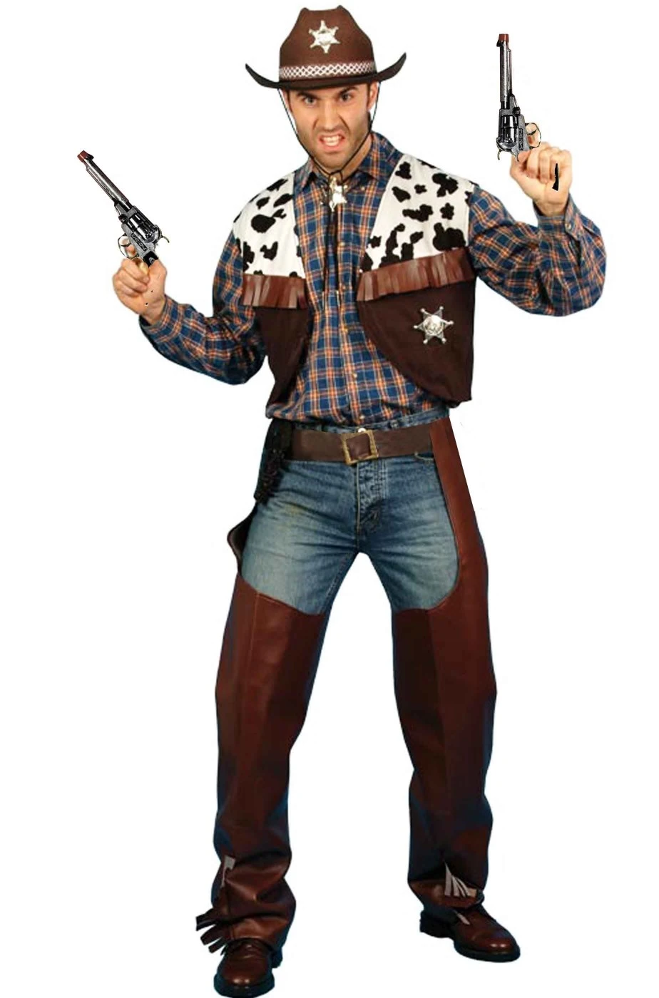 Un vestito di carnevale da cow boy sceriffo da indossare sui tuoi jeans e camicia perche’ include le gambiere cioe’ i mezzi pantaloni coprigamba ed il gilet con la stella da sceriffo
