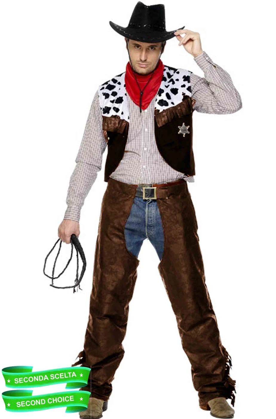 Costume di carnevale da sceriffo cowboy di esposizione, seconda scelta, scontato. Include le gambiere ovvero i coprigamba da indossare sopra ai propri jeans, in finta pelle con le frange ed il gilet marrone pezzato nero con la stella da sceriffo.