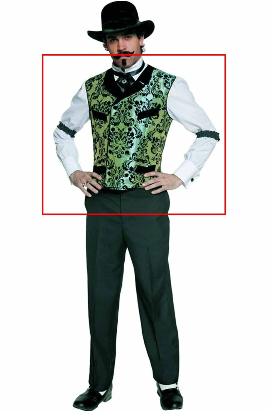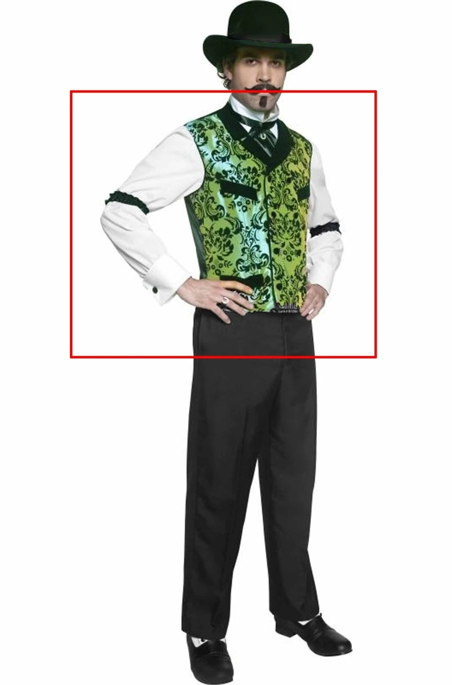Sei stato invitato ad una festa a tema western e non vuoi essere il solito cowboy o indiano? Questo e’ una idea davvero originale per il tuo vestito di carnevale. Riproduce infatti un bellissimo vestito da baro giocatore di poker dei saloon del far west. Il prodotto include la parte superiore dell’abito ovvero il gilet di un bellissimo e luminoso verde damascato con unite le maniche della camicia e le due giarrettiere per i manicotti per evitare che i polsi scendano nel dare le carte.