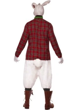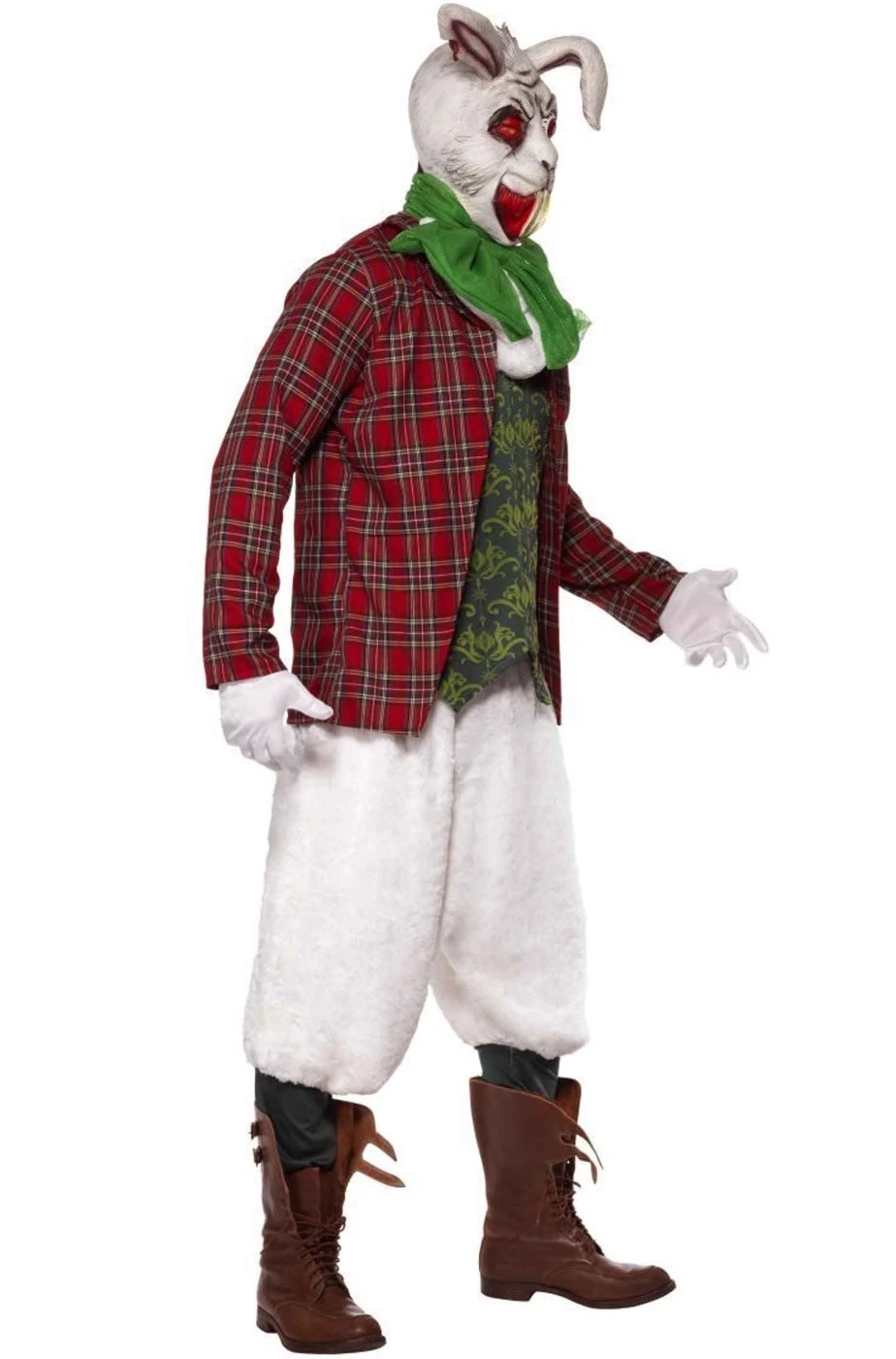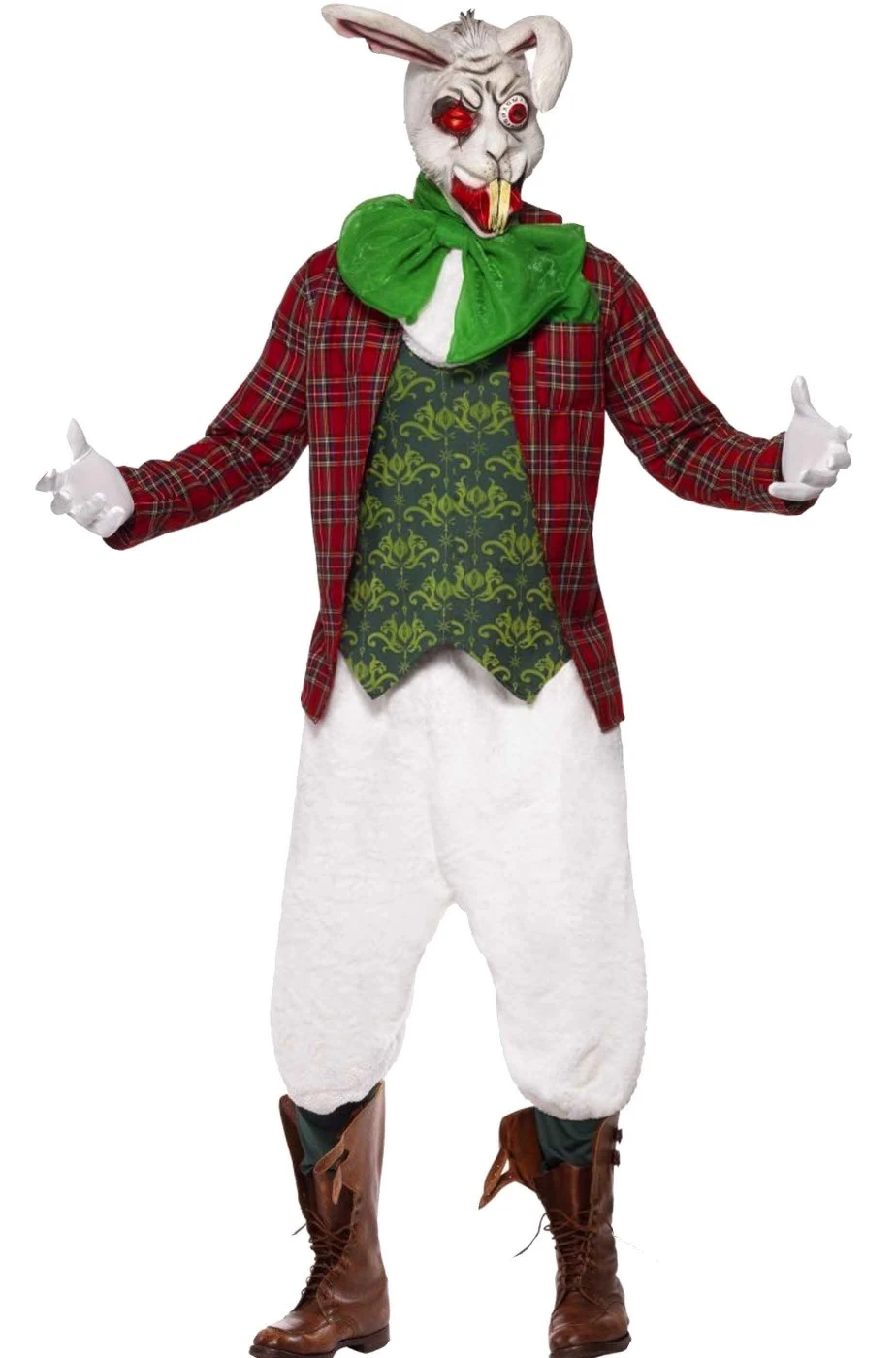Versione sanguinaria del costume di carnevale del tenero bianconiglio di Alice in Wonderland qui in versione vestito di Halloween davvero completo, spaventoso e divertente che include la giacca con attaccato il gilet, i pantaloni, la maschera di lattice a tutta testa e la cravatta.