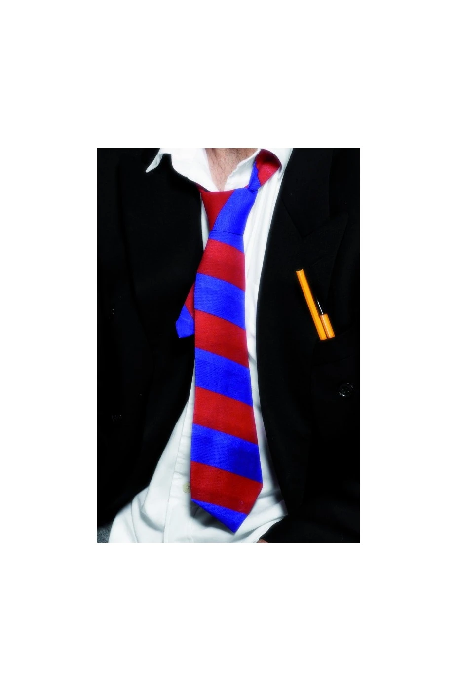 E sì perche’ questa e’ una cravatta rossa e blu a grandi righe trasversali che si adatta anche ad una divisa di una scuola di magia.