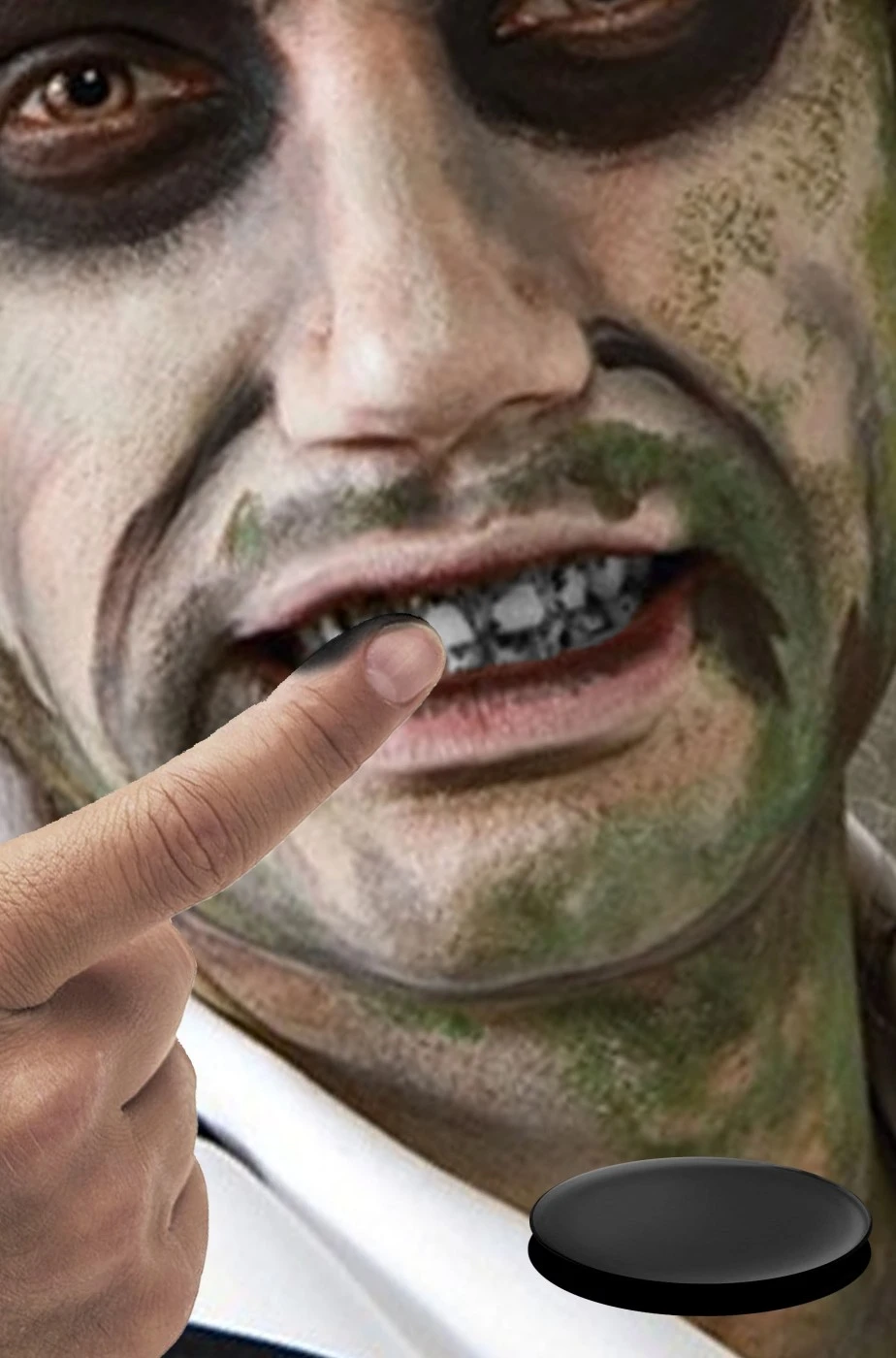 Colore nero per sporcare i denti o per creare il classico trucco del dente mancante. A base cera, si stende su tuo dente con le dita. Potrai creare la classica dentatura da pirata senza denti o un trucco da vecchio o da befana.