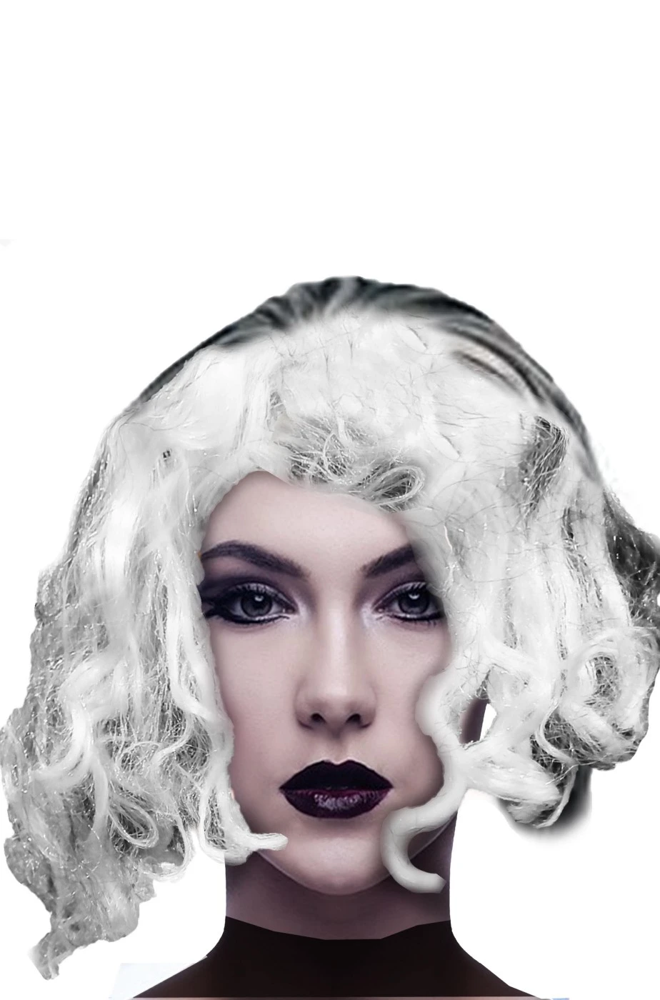 Parrucca di carnevale bianca e nera completamente spettinata e sparata per un vestito di halloween da crudelia pazza o per carnevale una vera demon folle appena uscita dal manicomio criminale