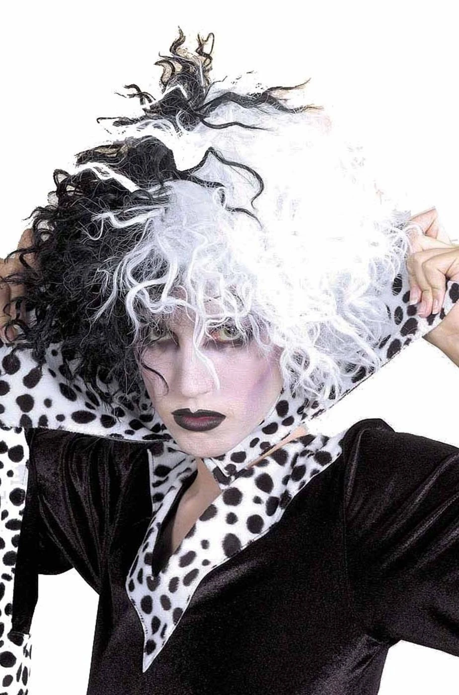 Ideale come parrucca di Crudelia Demon nei suoi momenti di follia la pazza inseguitrice dei 101 cagnolini dalmata nel famoso film disney La Carica dei 101 questa spettacolare parrucca bianca e nera arruffata da vera matta malvagia