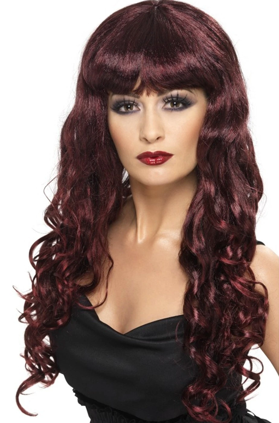 Affascinante e voluminosa parrucca da donna castana lunga mossa di un bel colore scuro tendente al rame. Una acconciatura elegante e signorile per dare un cambio di look alla tua immagine.