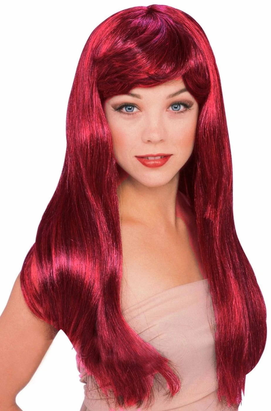 Parrucca di carnevale da donna liscia, lunga, con frangia e scriminatura di un bel color rosso con striature nere che la rendono perfetta da indossare come parrucca di Halloween su un vestito da diavolessa, da vampira o da strega.