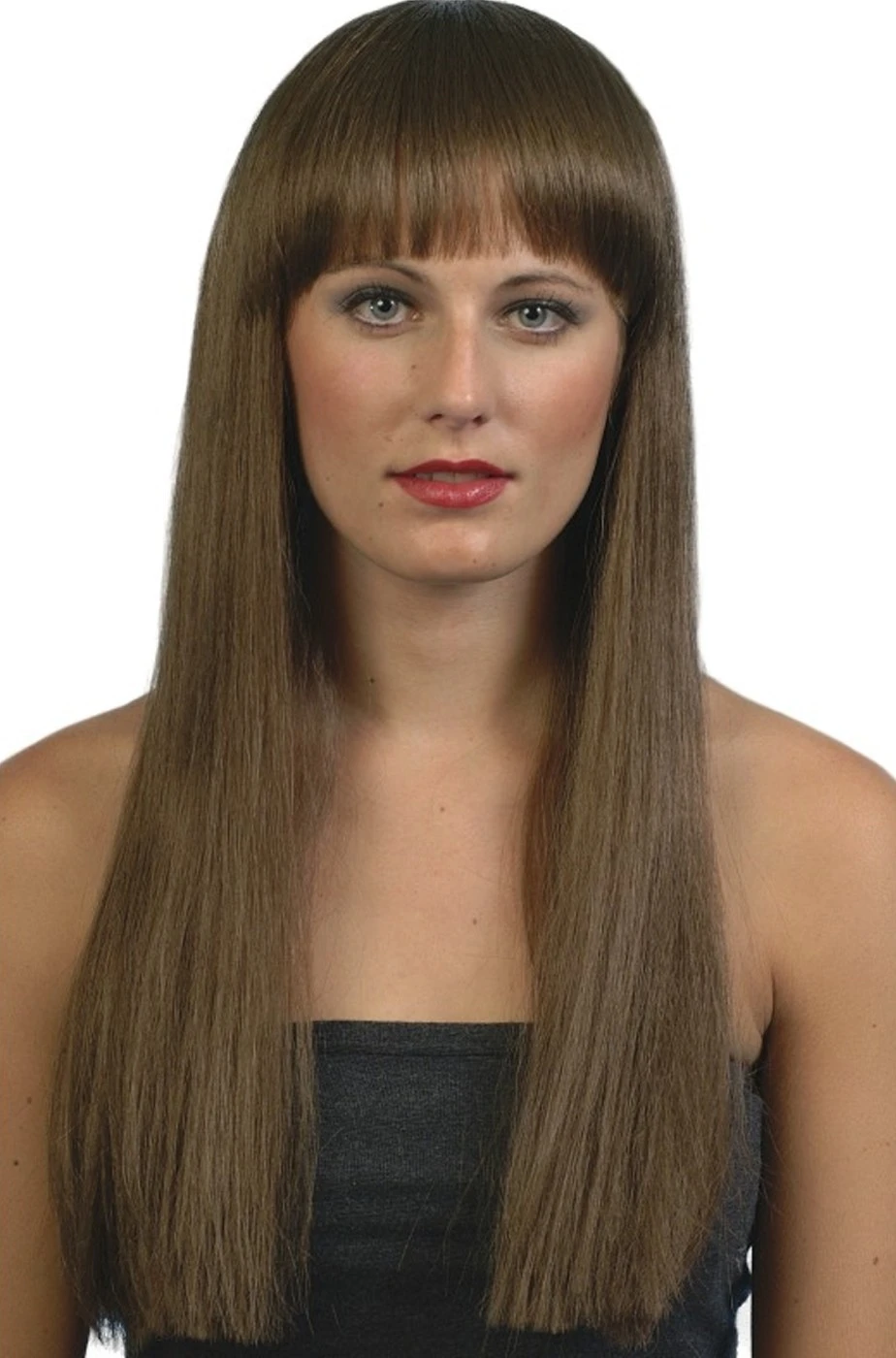 Parrucca di carnevale castana, lunga liscia con frangia. Capelli finti sintetici color marrone per un cambio di look immediato e spettacolare!