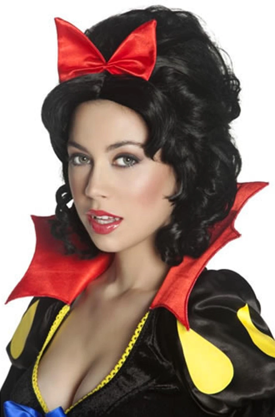 Parrucca nera ondulata con fiocco rosso per realizzare costumi di carnevale da Biancaneve anche in versione vestito di halloween horror.