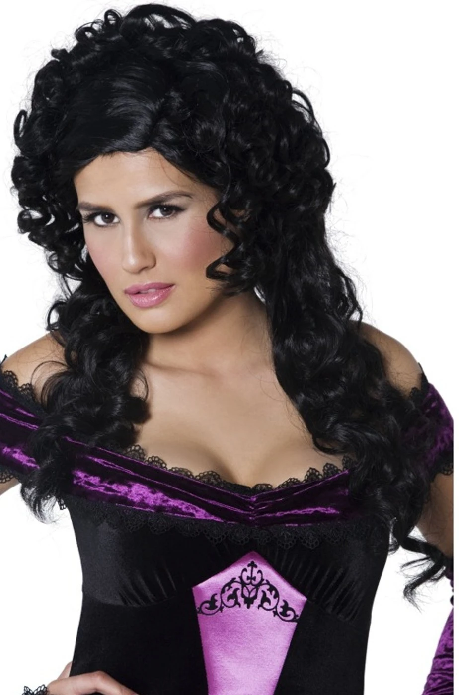 Con una bella acconciatura gonfia riccia e mossa e di un bel colore corvino potrai indossare questa parrucca nera lunga riccia per una dama gotica o per rendere il tuo look piu’ oscuro ed affascinante.