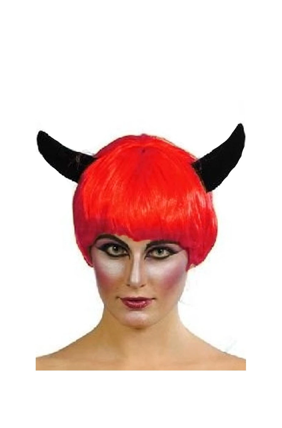 parrucca a caschetto rossa con corna nere per diavolessa, diavola e diavoletta