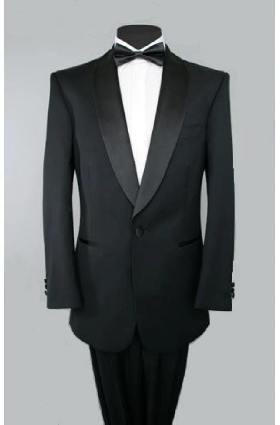 Smoking sciallato nero industriale in poliestere giacca e pantalone, sciallato con revere e banda sul pantalone in raso. Taglio classico non sciancrato.