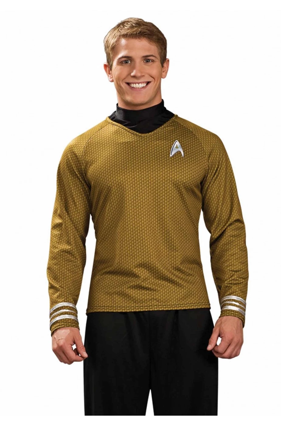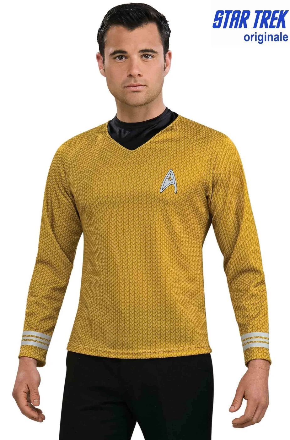 Per andare dove nessun uomo e’ mai giunto prima, indossa la maglia originale Star Trek gialla del capitano James T. Kirk. Qui nella versione dei film dal 2009 in poi quindi Star Trek, Star Trek Into Darkness e Star Trek Beyond, e gialla con la stampa a finto effetto trama. Il prodotto include la maglia gialla con la stampa con scollo a V ed il logo della flotta stellare o Starfleet in inglese sul petto.