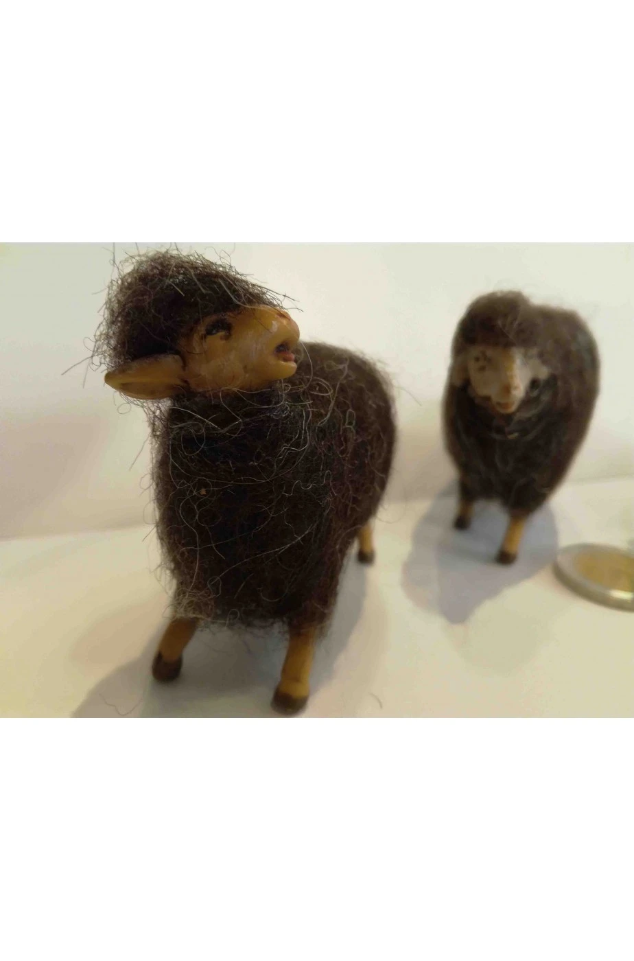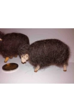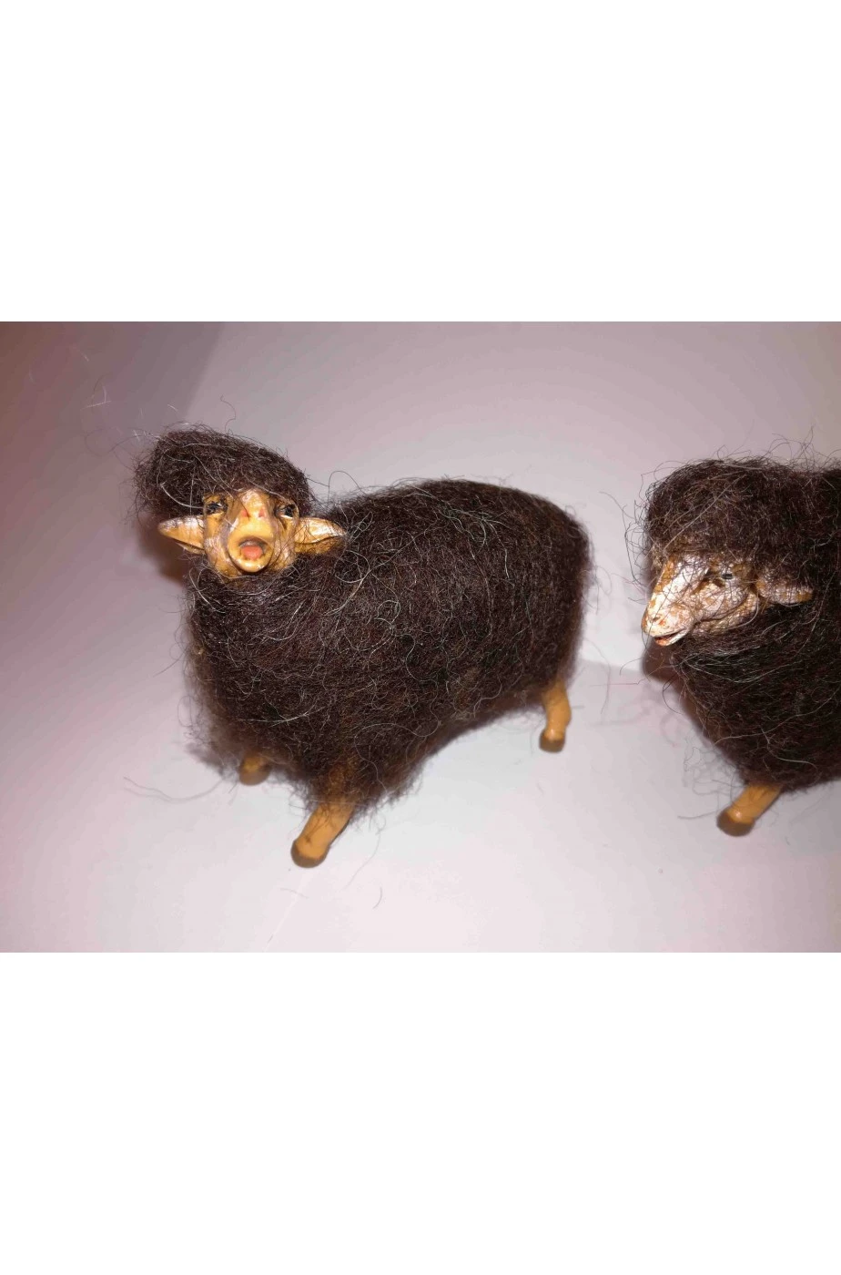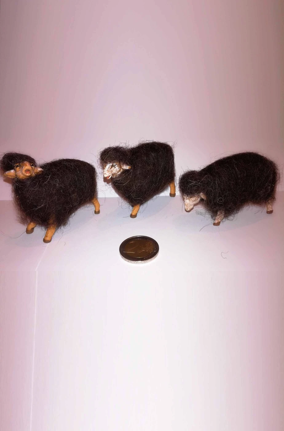Gregge di tre pecore marroni (pecore nere) ricoperte di lana vera avvolta a mano per Presepe lunghe circa 7cm perfette per ambientazioni presepio, diorami, plastici, modellismo. Molto belle e realistiche grazie alla lana vera raggomitolata intorno al corpo in plasica scolpito e dipinto a mano